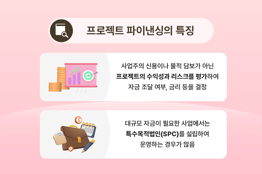 프로젝트파이낸싱의 특징을 좀 더 자세히 살펴볼까요? 일반적으로 대출은 차주(돈을 빌리는 사람)의 신용이나 물적 담보를 보고 돈을 빌려주지만, 프로젝트파이낸싱은 프로젝트의 수익성과 리스크를 평가하여 자금 조달 여부, 금리 등을 결정합니다.