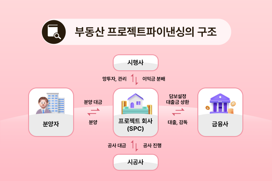 우리나라에서 프로젝트파이낸싱은 주로 부동산 PF를 의미합니다. 부동산 PF는 시공사가 책임 준공을 보증하고, 금융권이 일부 위험을 부담하는 구조로 이루어지는데요. 착공 전 단계에서 토지 매입 및 인허가를 위한 브릿지론이 실행되고, 이후 공사 단계에서 본 PF 대출이 실행되는 경우가 많습니다. 분양 대금은 본 PF 대출 상환과 공사 대금으로 사용되며, 준공 후에는 잔금 납입으로 대출 상환이 완료됩니다.