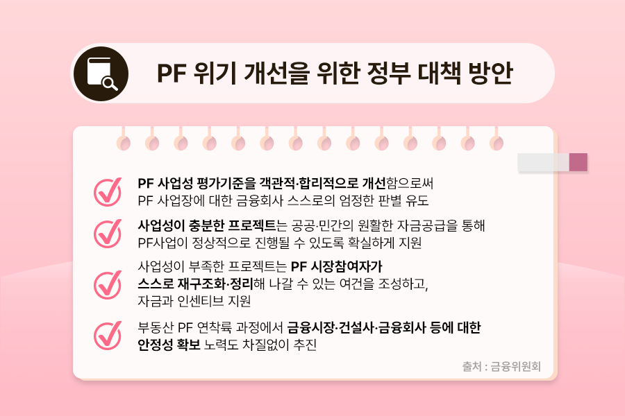 정부는 국내 부동산 PF 위기를 개선하기 위해 다양한 대책을 마련하고 있습니다. 지난 5월에는 금융위원회와 금융감독원이 그간 추진해 온 부동산 PF 연착륙 조치를 확대‧보완한 <부동산 PF의 질서 있는 연착륙을 위한 향후 정책 방향>을 발표하기도 했는데요. 주요 내용은 아래와 같습니다.
