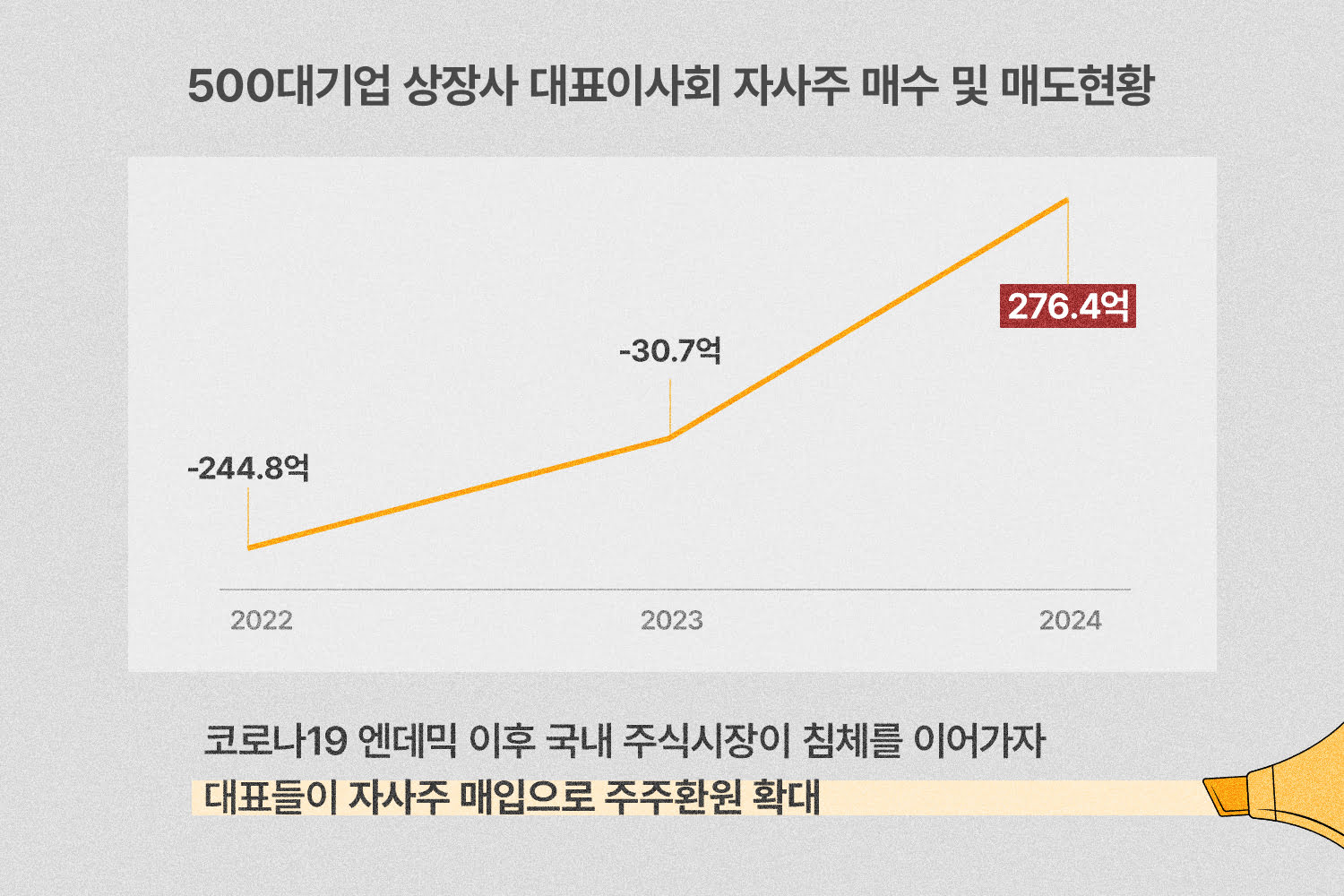 주요 대기업 상장기업 대표이사들의 자사주 순매수액이 3년째 증가하고 있다. 코로나19 엔데믹(풍토병화) 이후 국내 주식시장이 침체를 이어가자 대표들이 자사주 매입을 통해 주주환원 확대에 나섰다는 분석이다.