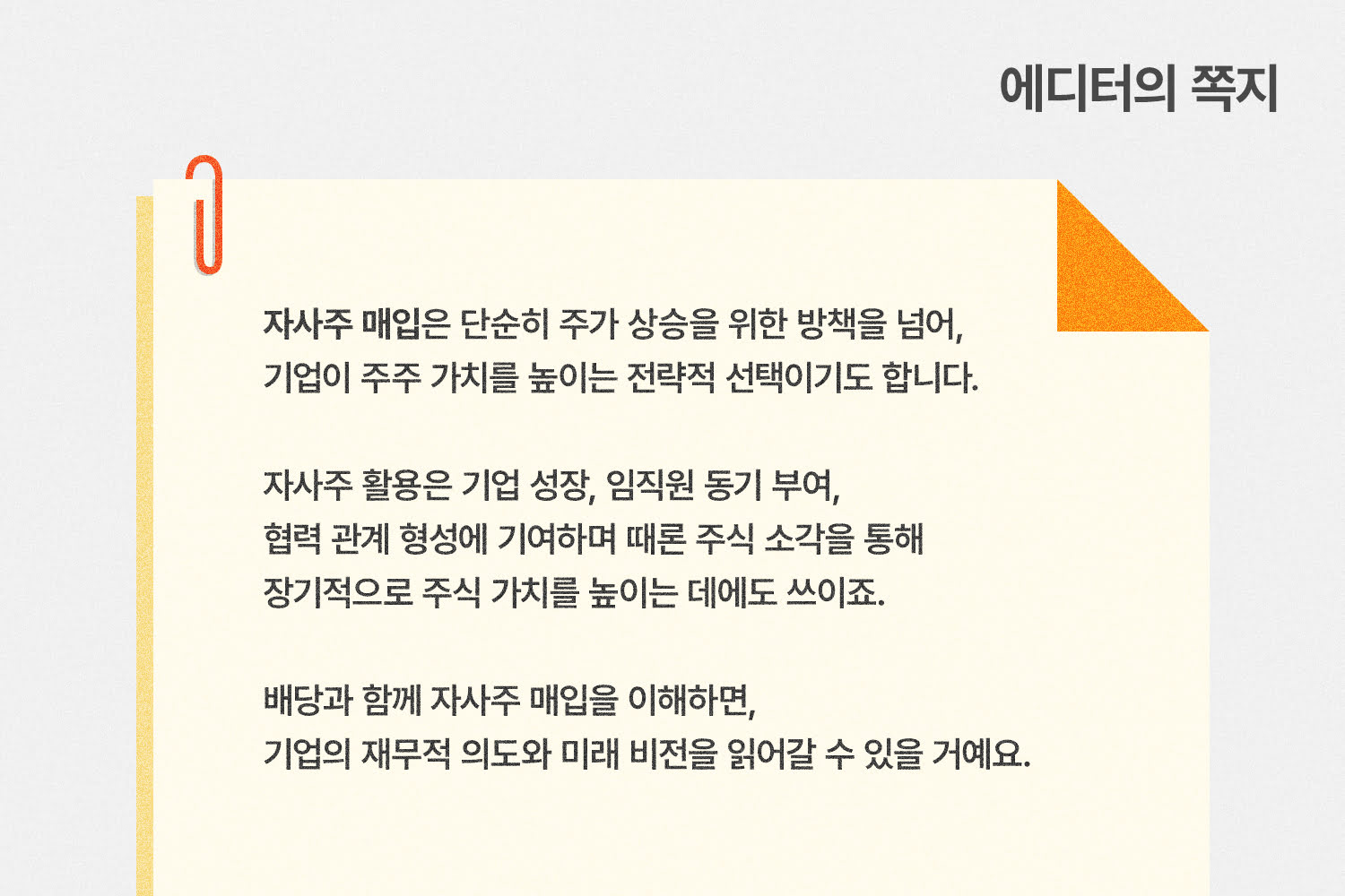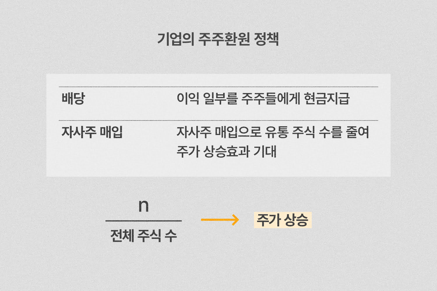발행 주식이 줄어들면 남아있는 주식의 가치가 올라가기 때문에 주주들이 보유한 주식의 가치도 덩달아 상승하게 됩니다. 이러한 주가 상승이 자산 가치 증대 효과를 가져올 수 있는 거예요. 즉, 자사주 매입은 현금을 지급하지 않지만, 주주들이 보유 주식의 가치를 높여 간접적으로 혜택을 받는 방법입니다.