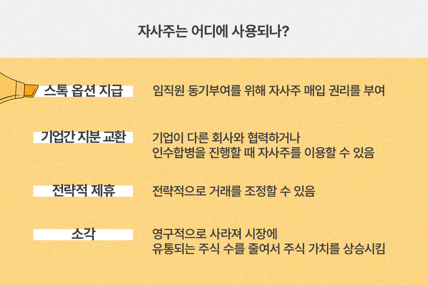 또한, 자사주는 기업 간 지분 교환이나 전략적 제휴를 위해서도 활용됩니다. 기업이 다른 회사와 협력하거나 인수합병을 진행할 때, 자사주를 이용해 지분을 교환하거나 거래를 조정할 수 있습니다. 기업의 중요한 협상 도구로 활용할 수 있는 거죠.