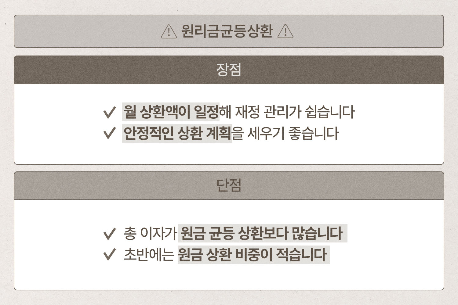 하지만 전체 상환금을 대상으로 이자를 매기기 때문에 갚아야 하는 총 이자는 원금 균등 상환에 비해 다소 높습니다. 또 초반에는 이자의 비율이 높아 중도 상환 시 원금 상환 비중이 낮아지는 단점이 있습니다. 중도 상환 계획을 고려한다면, 한 번 더 생각해 봐야 하는 선택지입니다.
