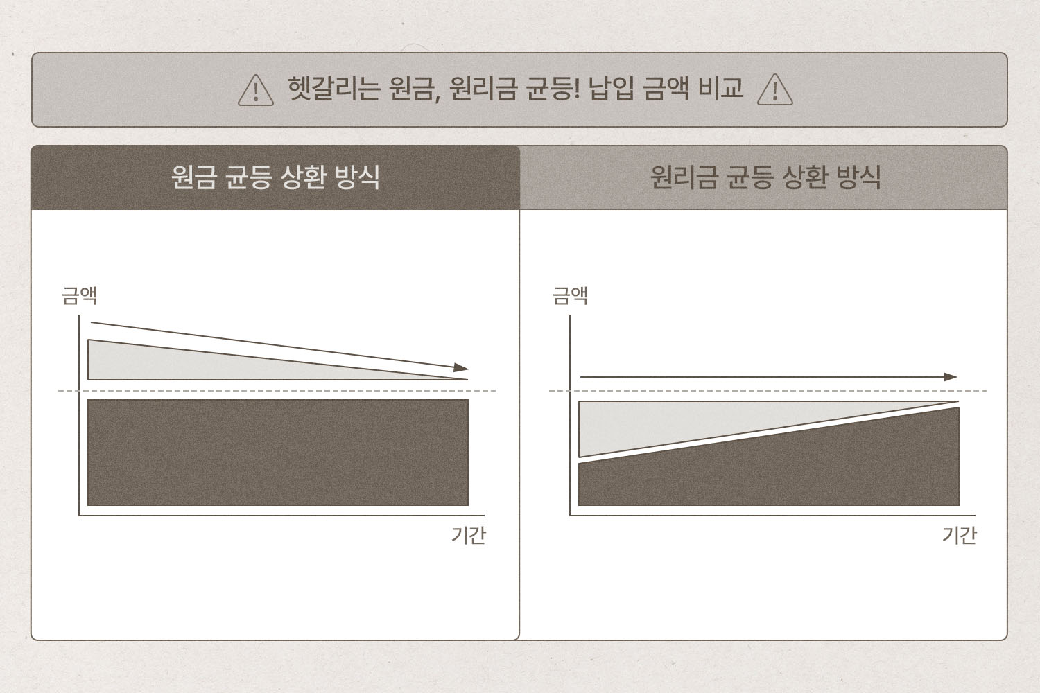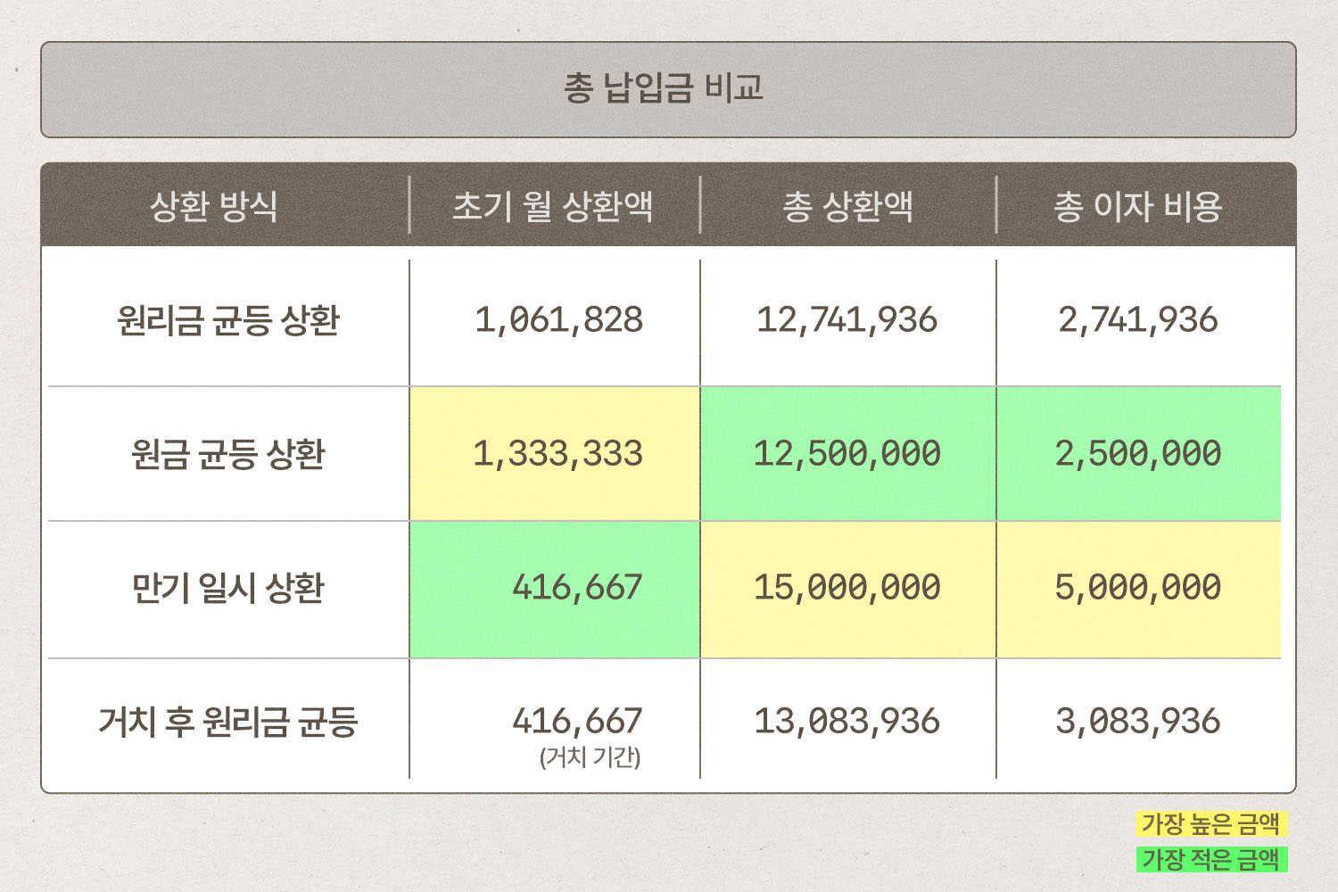 원금 균등 상환을 고려하세요. 초기 부담은 크지만, 이자 비용이 가장 적어 총 비용이 줄어듭니다.