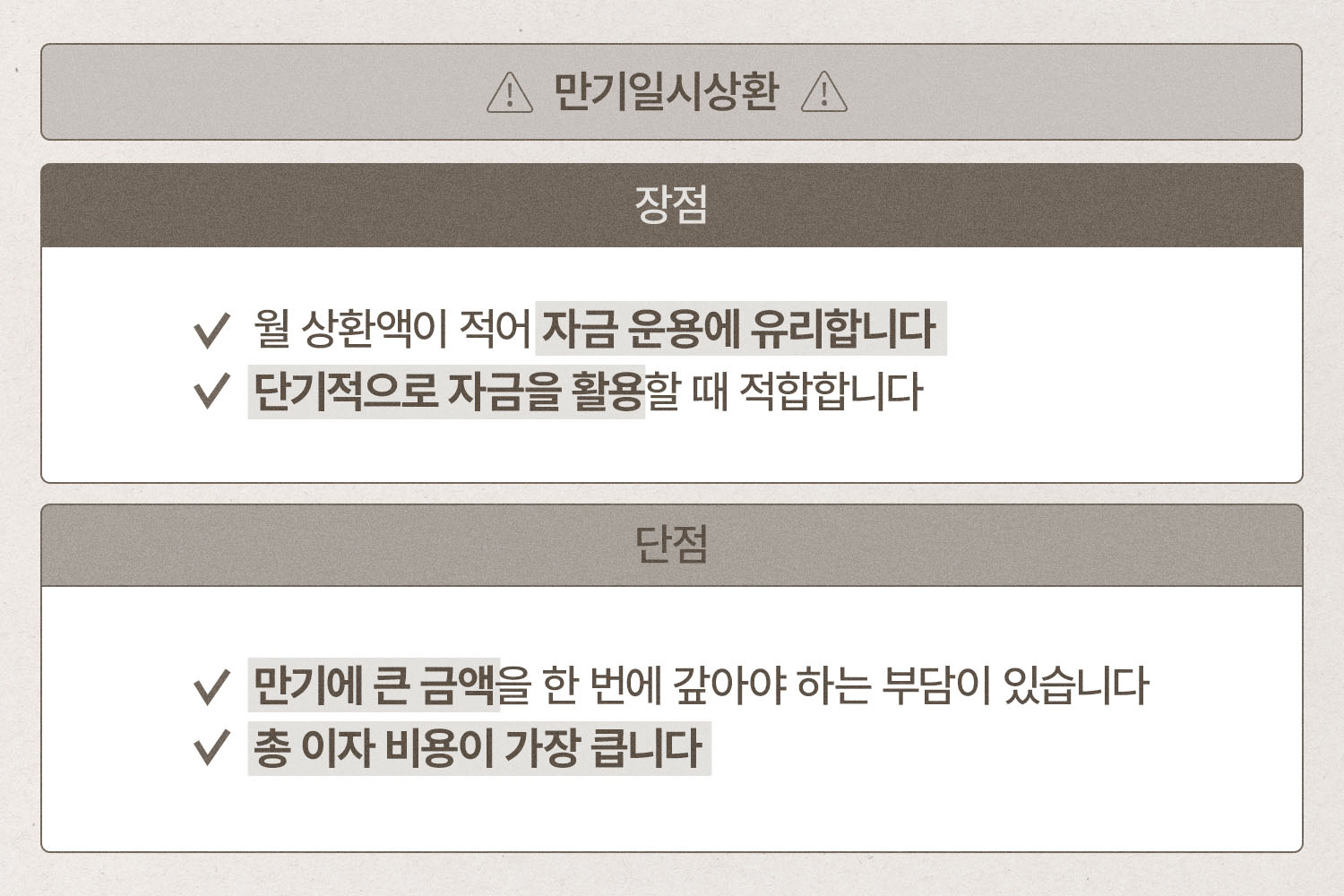 만기 일시 상환이나 거치 후 원리금 균등 상환이 적합합니다. 다만, 이 경우 총 이자 비용이 늘어날 수 있음을 주의하세요.