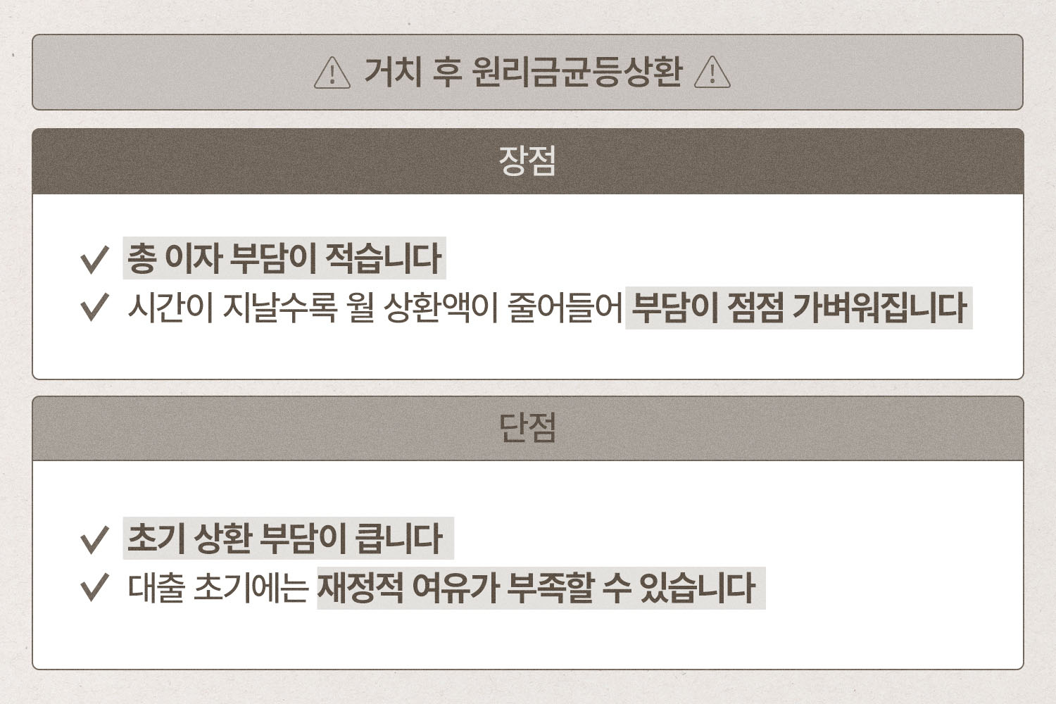 거치 후 원리금 균등 상환은 초기 몇 년 동안 이자만 납부하고, 이후 원리금 균등 상환 방식으로 전환되는 방식입니다. 거치 기간 동안 원금 상환이 이루어지지 않아 총 이자가 늘어나는 단점이 있지만, 초기 자금 부담이 적어 재정적 여유를 확보할 수 있습니다.