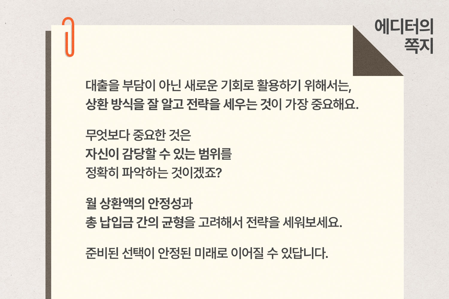 3. 자신의 재무 상황과 목표에 맞는 상환 방식을 선택하면, 대출 상환의 스트레스를 줄일 수 있습니다.
