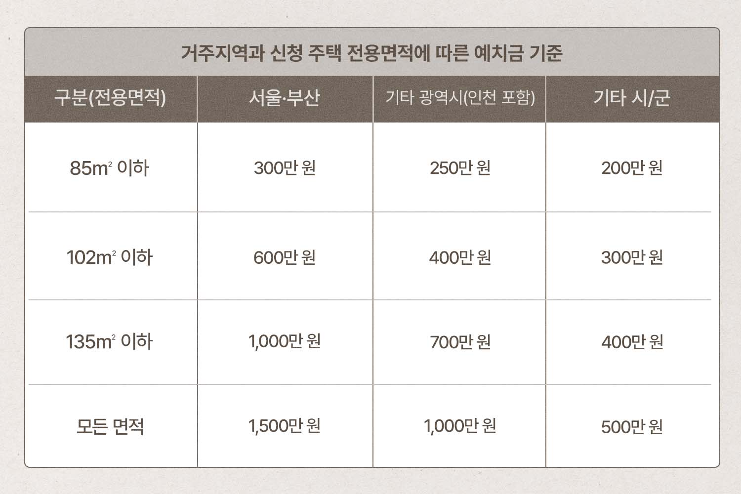 반면 민영주택 청약에서는 '납입 횟수'보다는 '예치금'이 더 중요해요. 예치금 기준은 거주 지역과 신청 주택의 전용면적에 따라 다르게 적용돼요. 예치금은 모집공고일 전일까지 충족해야 하며, 다음과 같은 기준을 참고할 수 있어요