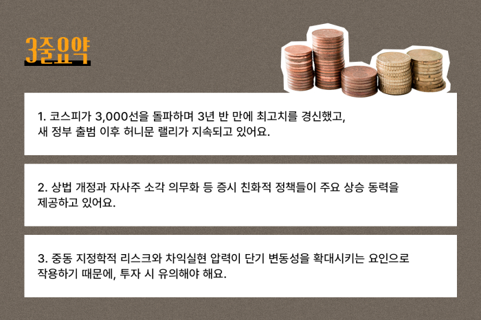 코스피 3,000선 돌파는 숫자 하나가 바뀌는 것이 아니에요. 우리나라 경제와 기업들에 대한 시장의 신뢰가 회복되고 있다는 신호이기도 하죠. 새 정부의 증시 친화적 정책들이 실제로 효과를 보이기 시작했다는 의미이기도 하고요.